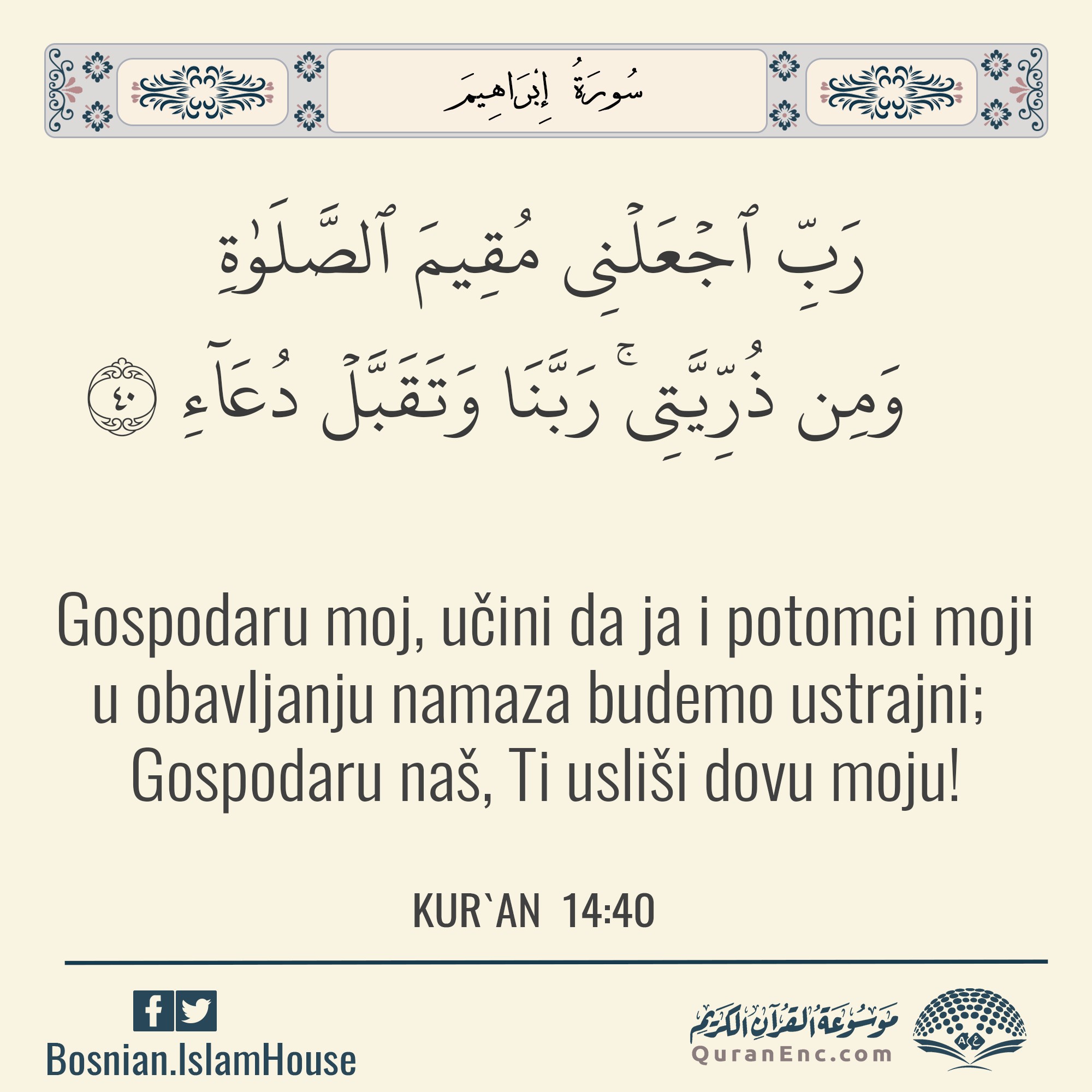 Gospodaru moj, daj da ja i potomci moji u obavljanju namaza budemo ustrajni; Gospodaru naš, Ti usliši dovu moju!