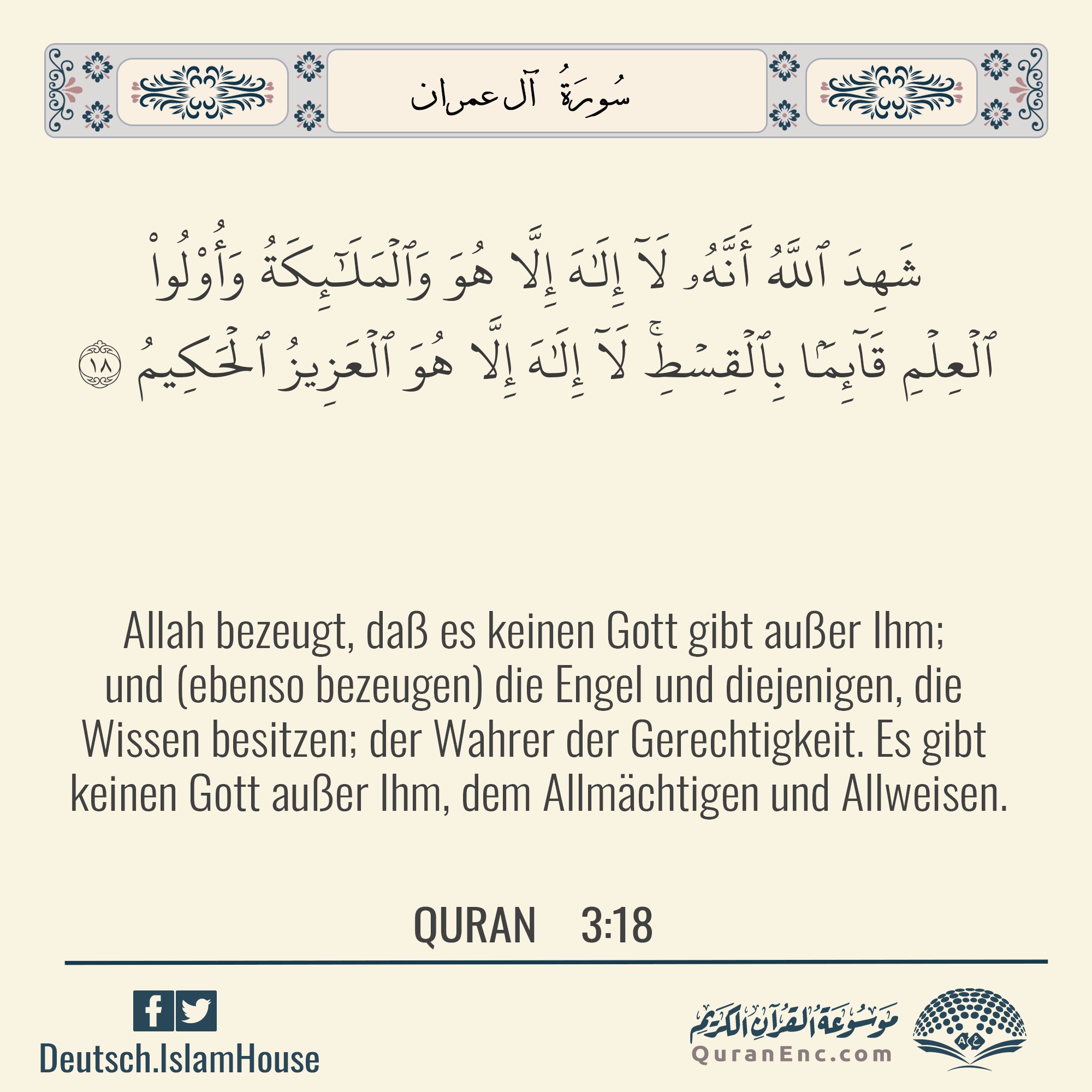 Allah bezeugt, daß es keinen Gott gibt außer Ihm; und (ebenso bezeugen) die Engel und diejenigen, die Wissen besitzen; der Wahrer der Gerechtigkeit. Es gibt keinen Gott außer Ihm, dem Allmächtigen und Allweisen.