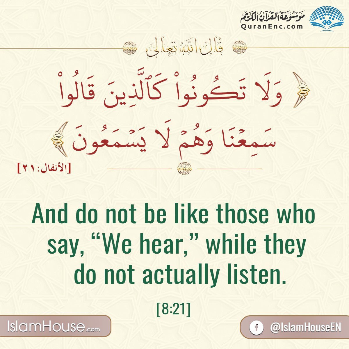 Loginوَلَا تَكُونُواْ كَٱلَّذِينَ قَالُواْ سَمِعۡنَا وَهُمۡ لَا يَسۡمَعُونَ