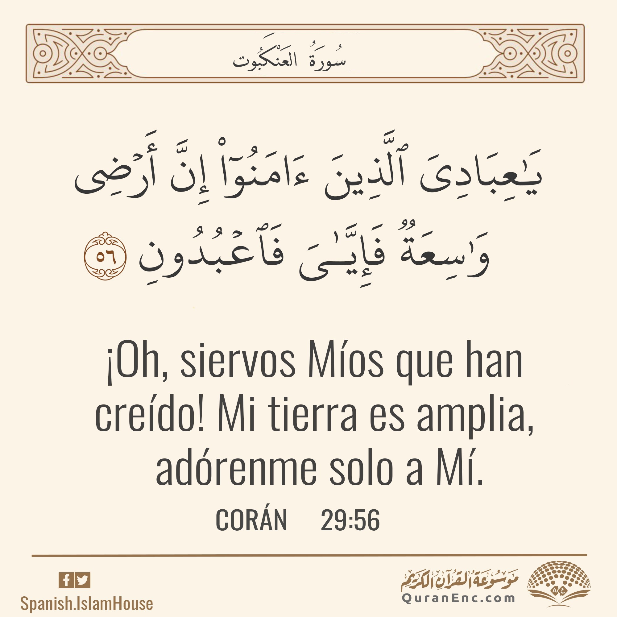 ¡Siervos míos, vosotros que creéis!, (si no podéis adorarme libremente allí donde vivís, sabed que) Mi tierra es vasta (para que emigréis); adoradme, pues, solo a Mí.