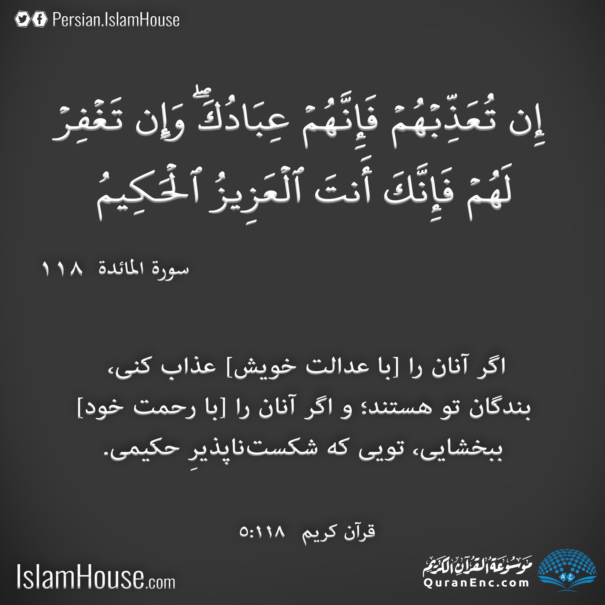 اگر آنان را [با عدالت خویش] عذاب کنی، بندگان تو هستند؛ و اگر آنان را [با رحمت خود] ببخشایی، تویی که شکستناپذیرِ حکیمی».
