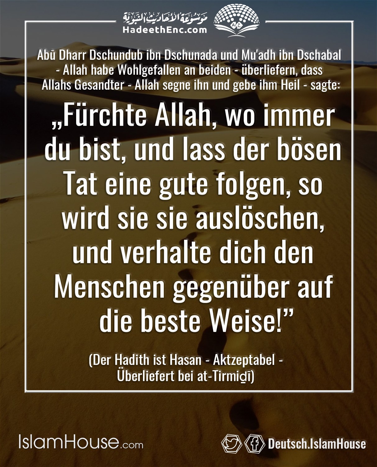 „Habe Furcht vor Allah wo immer du dich befindest. Und lasse der schlechten Tat eine gute folgen, so löscht sie diese dann aus. Und begegne den Menschen mit gutem Charakter (mit gutem Benehmen).“