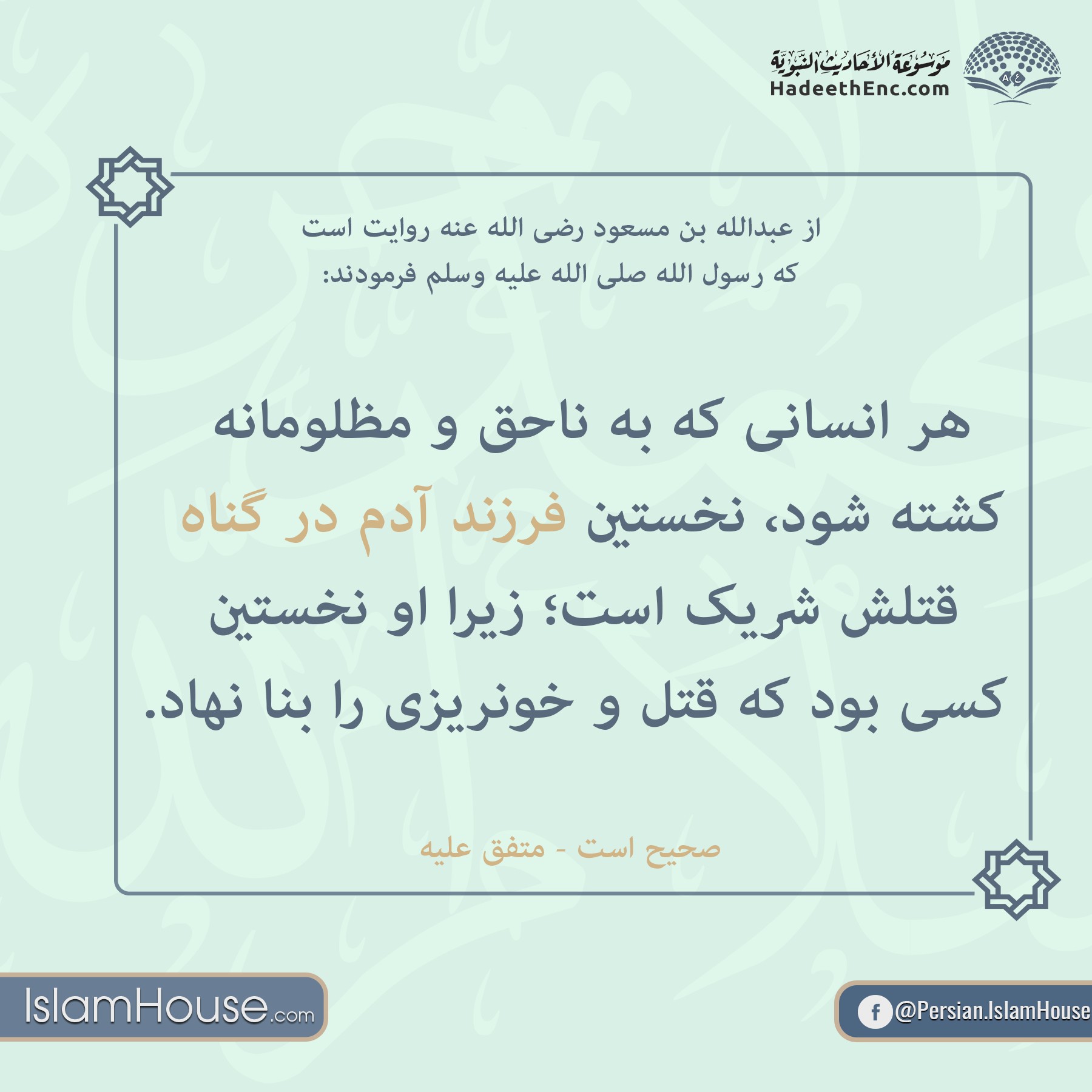 هر انسانی که به ناحق و مظلومانه کشته شود، نخستين فرزند آدم، در گناه قتلش شريک است؛ زيرا او نخستين کسی بود که قتل و خونريزی را بنا نهاد.