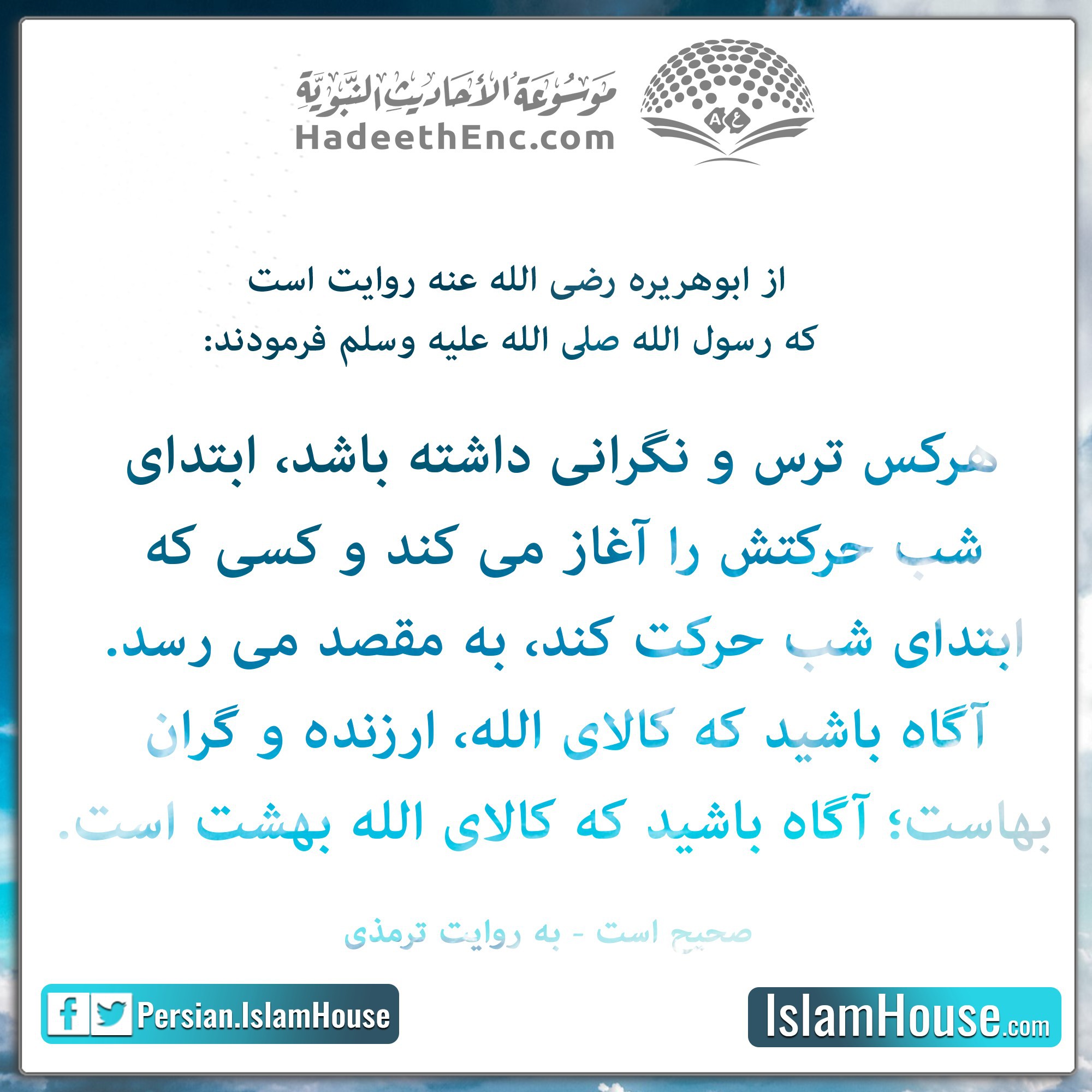 هرکس ترس و نگرانی داشته باشد، ابتدای شب حرکتش را آغاز می کند و کسی که ابتدای شب حرکت کند، به مقصد می رسد. آگاه باشيد که کالای الله، ارزنده و گران بهاست؛ آگاه باشيد که کالای الله بهشت است.